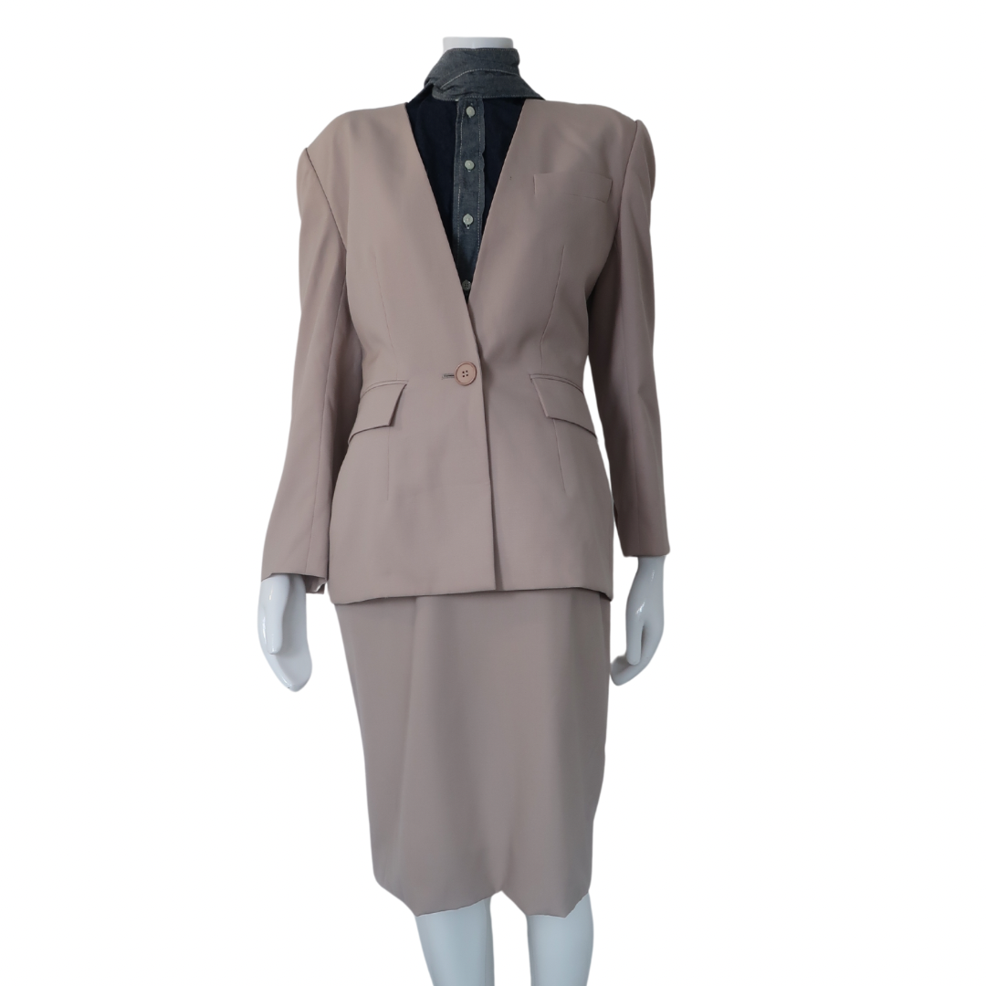 This Christian Dior suit showcases a timeless and elegant design, featuring a blazer and skirt in a soft beige hue. The blazer has structured shoulders and a tailored fit, with a single-button closure that gives a refined, professional look. The skirt complements the blazer with a knee-length cut, offering a sleek silhouette. The combination of classic lines and neutral color makes this Dior ensemble ideal for sophisticated workwear or formal occasions.